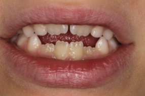 - Nyitott harapás, amikor egy vagy több fog nem érintkezik az alsó fogakkal zárt helyzetben. (leggyakrabban az elhúzódó cumizás következménye)