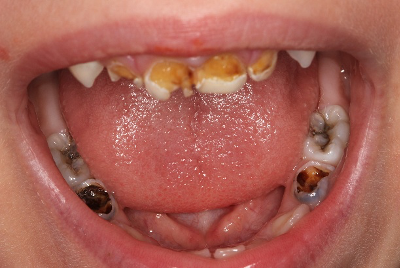 4 éves gyermek eltávolítandó szuvas fogai, ami később fogívszűkületet, tehát fogtorlódást okozhat.